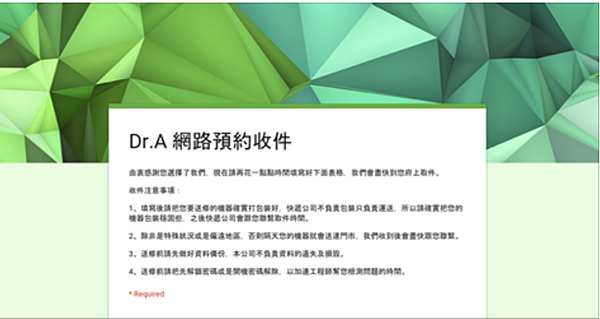 請問你們有到府維修服務嗎?請問你們可以到府收件嗎?我可以寄去給你們維修嗎?我很忙,你們可以過來收件嗎?下雨天不想出門耶!你們可以過來收件嗎?我們家附近沒有你們門市,怎麼讓你們維修?......各種聲音聽的小編我也是醉了,小編在這統一回覆你們:沒~問~題!小編火速請Dr.A成立網路預約收件部門來幫助你們XD。